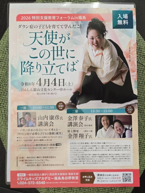 2026/02/27 講演会 <講演日時・テーマ> 第一部 2026年4月4日(土)10:00~11:30 登壇者:山内康彦(障がい児成長支援協会理事長) テーマ:~子供の将来の自立について考える~ 「特別支援が必要な子どもの進路と就労」 第二部 2026年4月4日(土)13:30~15:00 登壇者:金澤康子先生、金澤翔子先生(書道家) 「ダウン症の子どもを育てて学んだこと」 ~天使がこの世に降り立てば~ ※定員各300名、入場無料。事前予約制です。 詳細は添付の画像をご覧ください。